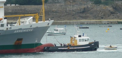 14:05, two tugs involve to complete the docking on coffers. Davier retrieves capella hawsers for the coffers while the Grand Bé pushes the Annemieke to port to keep her in line.