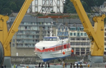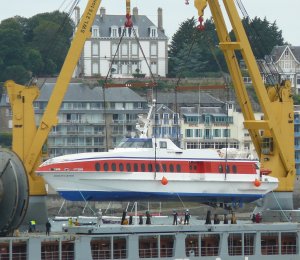 Le Jacques Cartier est posé délicatement à l'eau à 17h00, accueilli à coup de cornes de brume par les nombreux bateaux locaux venus l'accueillir.